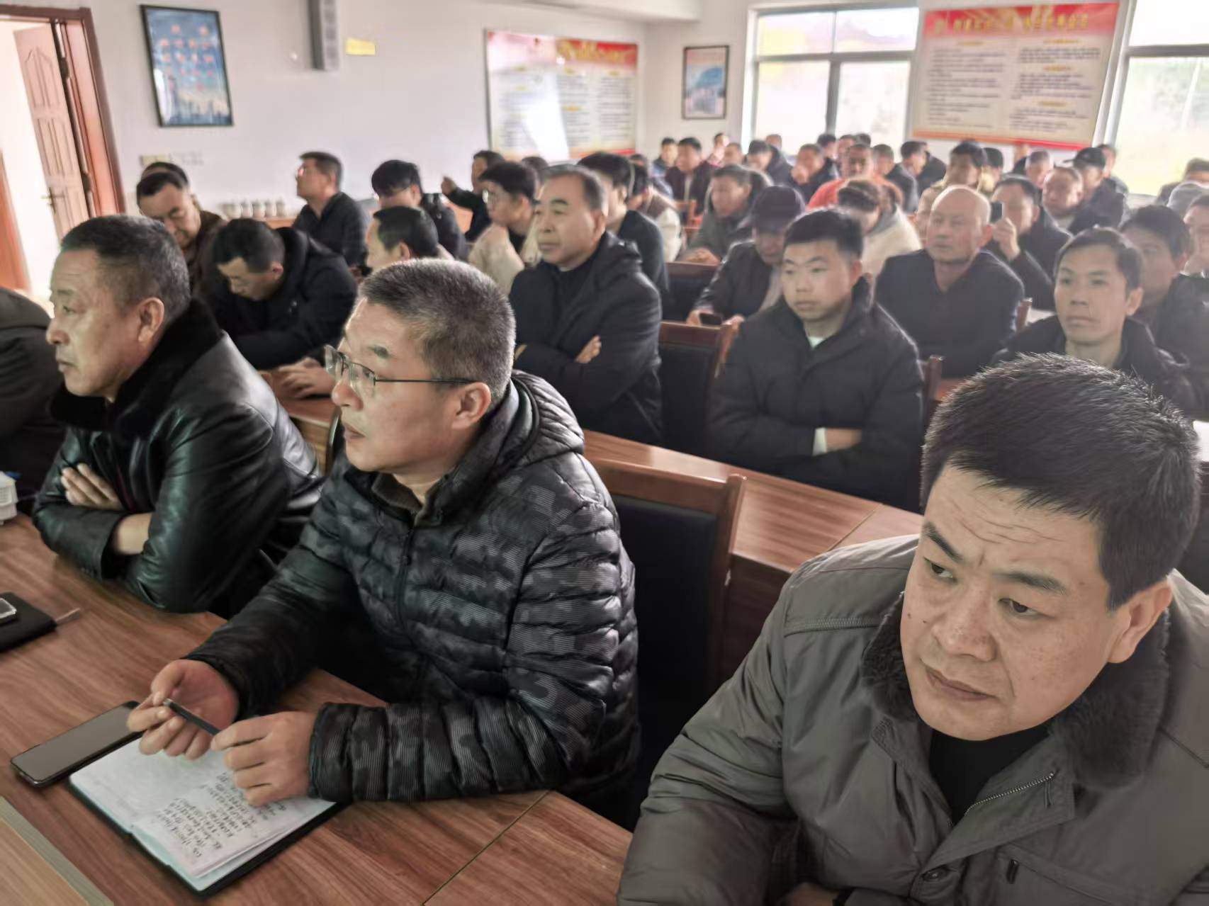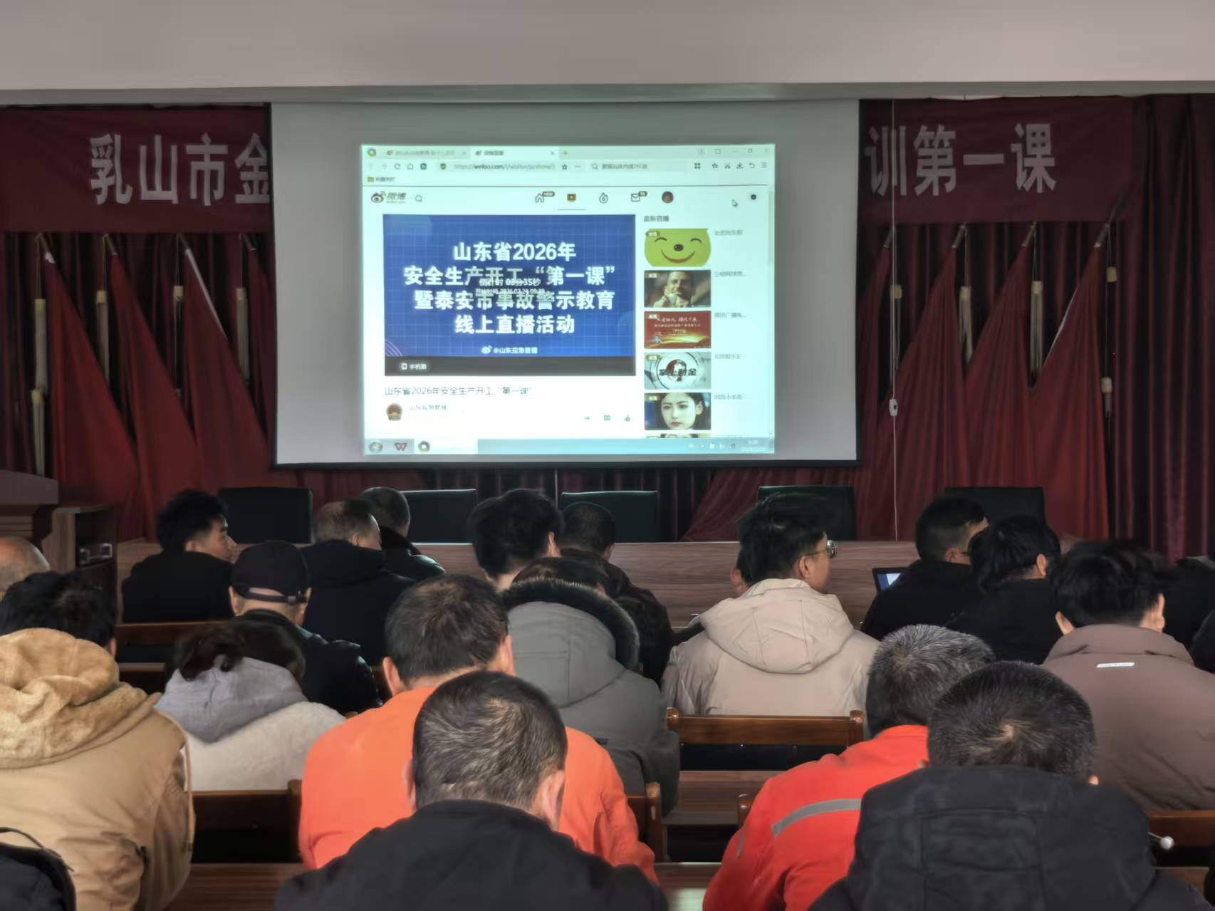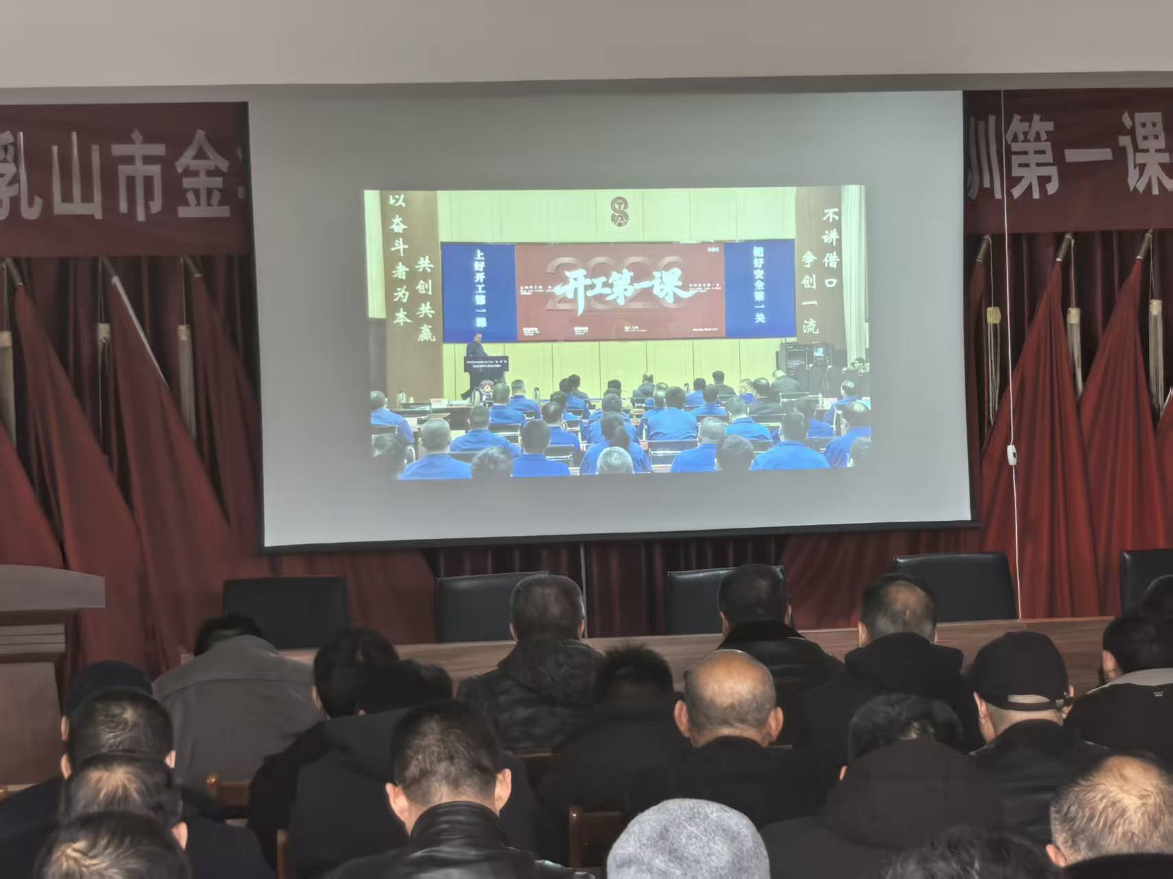 On February 24, 2026, Rushan Jinhua Mining Co., Ltd. organized all mine staff to watch the live broadcast in the meeting room on the third floor.